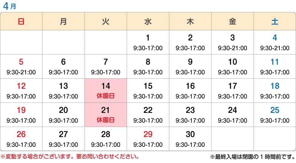 今月の休園日【2026年4月】